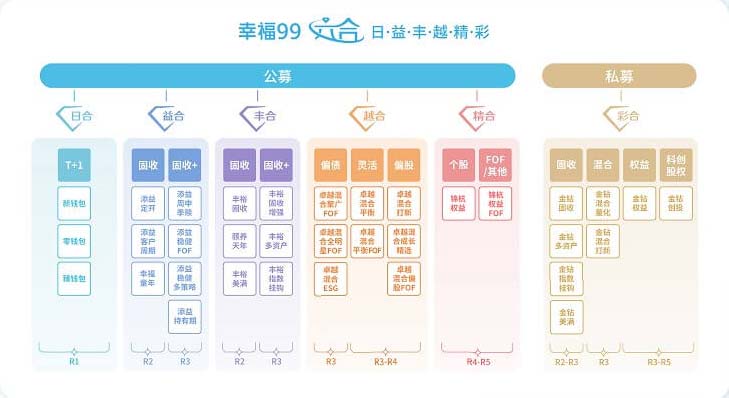 杭银理财传承原有“幸福99”品牌文化,融入以合为本、合家欢乐、共同富裕的幸福概念,以“日益丰,越精彩”寓意“物质日益富足、生活越发精彩”的幸福元素,体现杭银理财致力于成为百姓信赖的财富管理专家的担当与信念。杭银理财结合原有品牌价值、财富管理需求,设立以“日合、益合、丰合、越合、精合、彩合”为核心的“六合”产品体系,分别对应“现金管理类、开放式固收类、封闭式固收类、混合类、权益及另类、私募类”六大产品类型,以不同的资产投向、产品形态配合客户体验及风险偏好,力争为投资者打造风险收益特征鲜明、具有阶梯层次的产品体系。